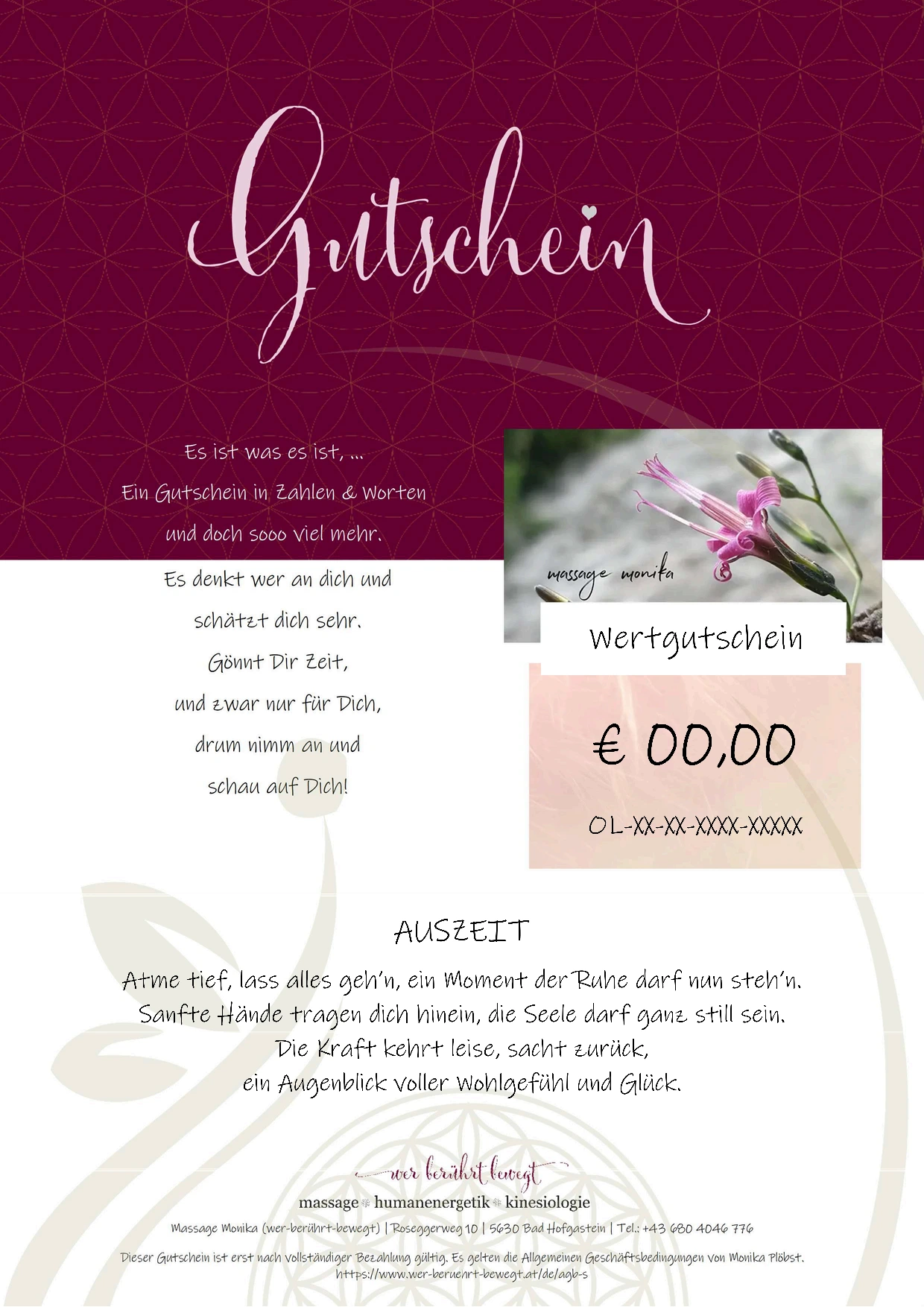 Es gelten die Allgemeinen Geschäftsbedinungen von Massage Monika.